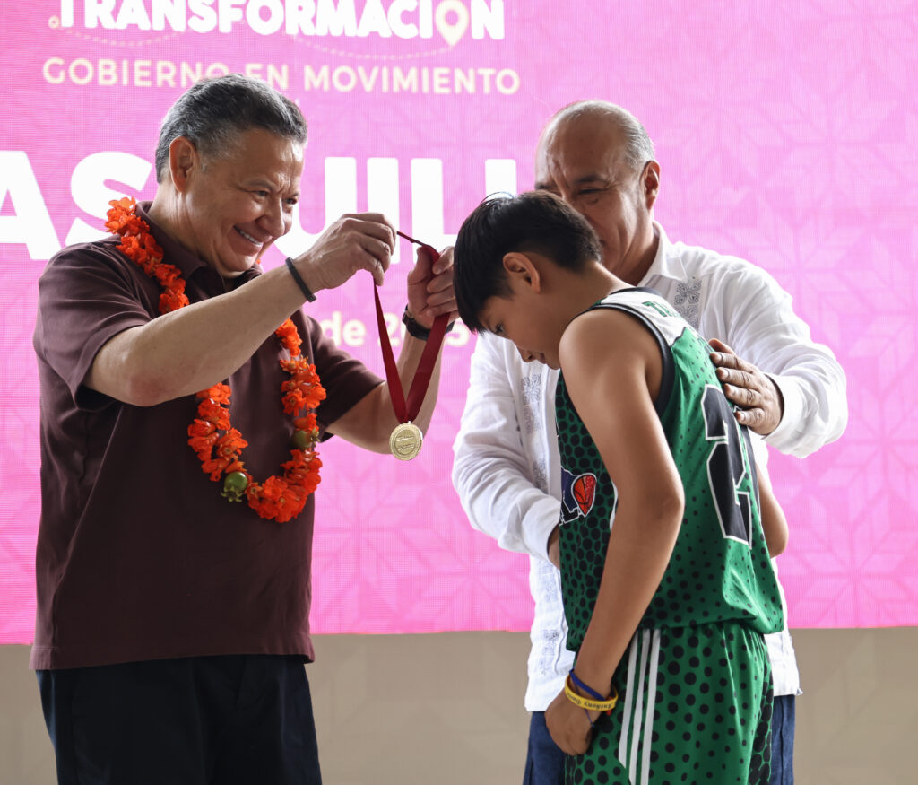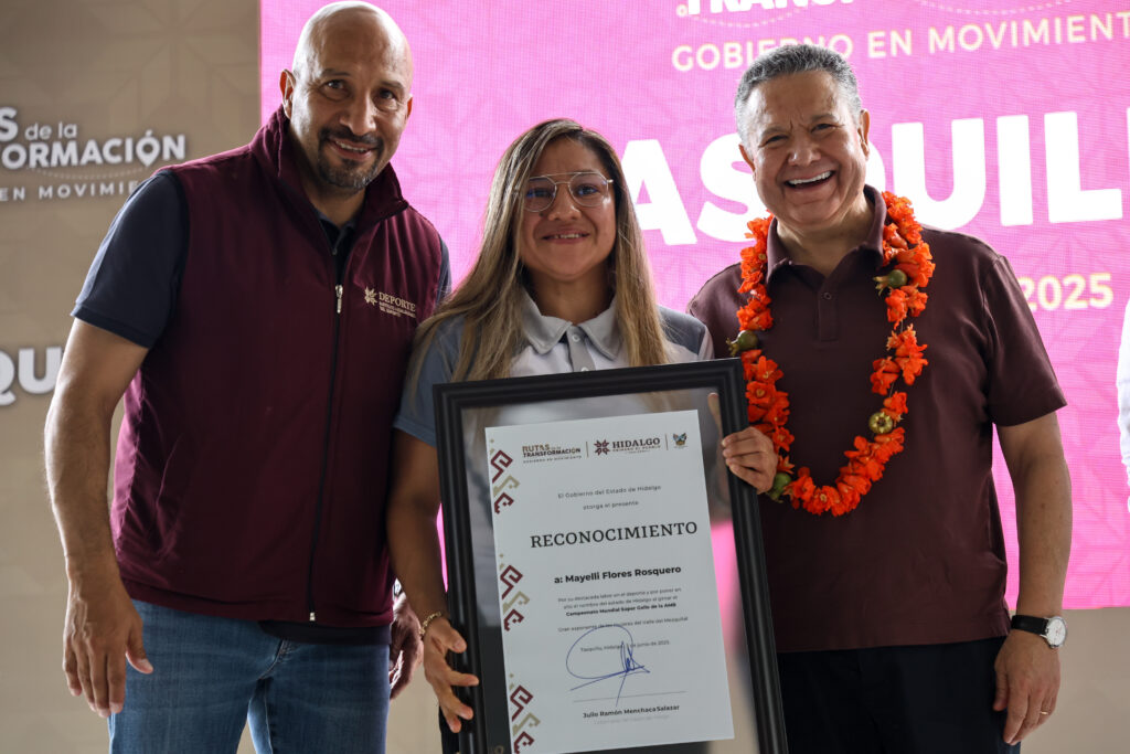 Como parte del evento, el gobernador Julio Menchaca entregó un reconocimiento a la boxeadora Mayelli Rosquero, por ganar el Campeonato Mundial Supergallo WBA; además, otorgó medallas a niñas y niños ganadores de la Copa Hidalgo 2025, en las modalidades de basquetbol femenil y varonil.
