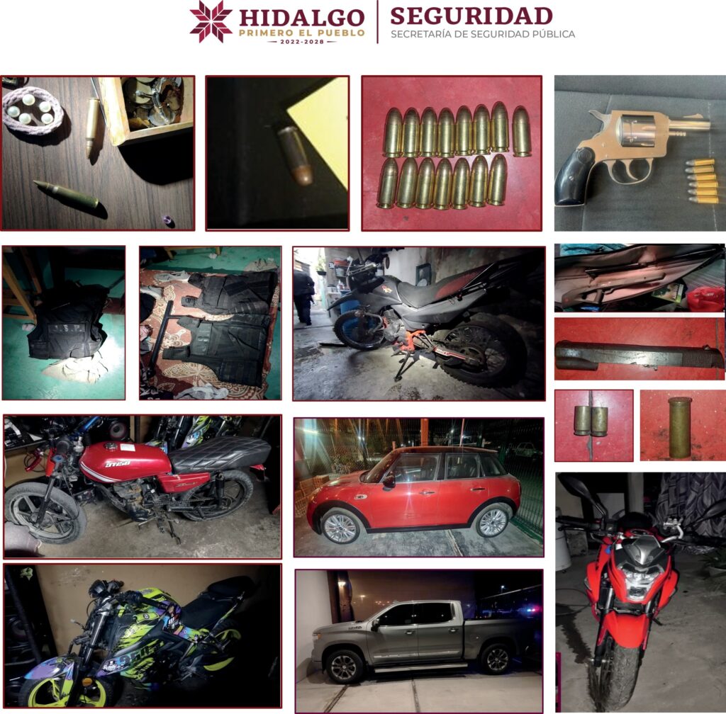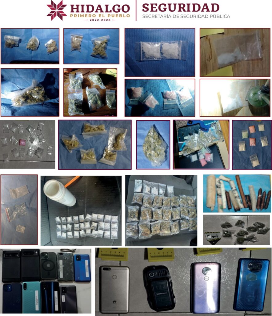 Mientras tanto, durante el desarrollo de cuatro cateos más en la colonia Francisco I. Madero del municipio de Tulancingo de Bravo, fueron asegurados dos hombres y tres mujeres que responden a las iniciales A. F. M., O. G. V., C. B. M., R. I. T. V., y R. M. O., quienes tenían en su posesión 556 dosis de presunta droga y “churros” con características propias de la marihuana, tres chalecos tácticos, cuatro motocicletas sin placas, cuatro celulares, un arma corta y 24 cartuchos de diferentes calibres.
